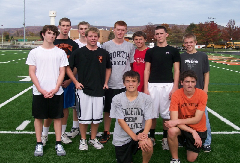 Ten players ran a time of 6:30 or better. Front row (left to right) are John Remsburg (5:54) and Brendan McCarrick (6:27). Back row (left to right) are Conner Mills (6:24), Morgan Winn (5:59), Jordan Hall (6:22), Kevin Harris (6:20), Doug Jesse (6:13), Logan Beckner (6:24), Chase Lebedda (6:22), and Aaron Arney (6:15).